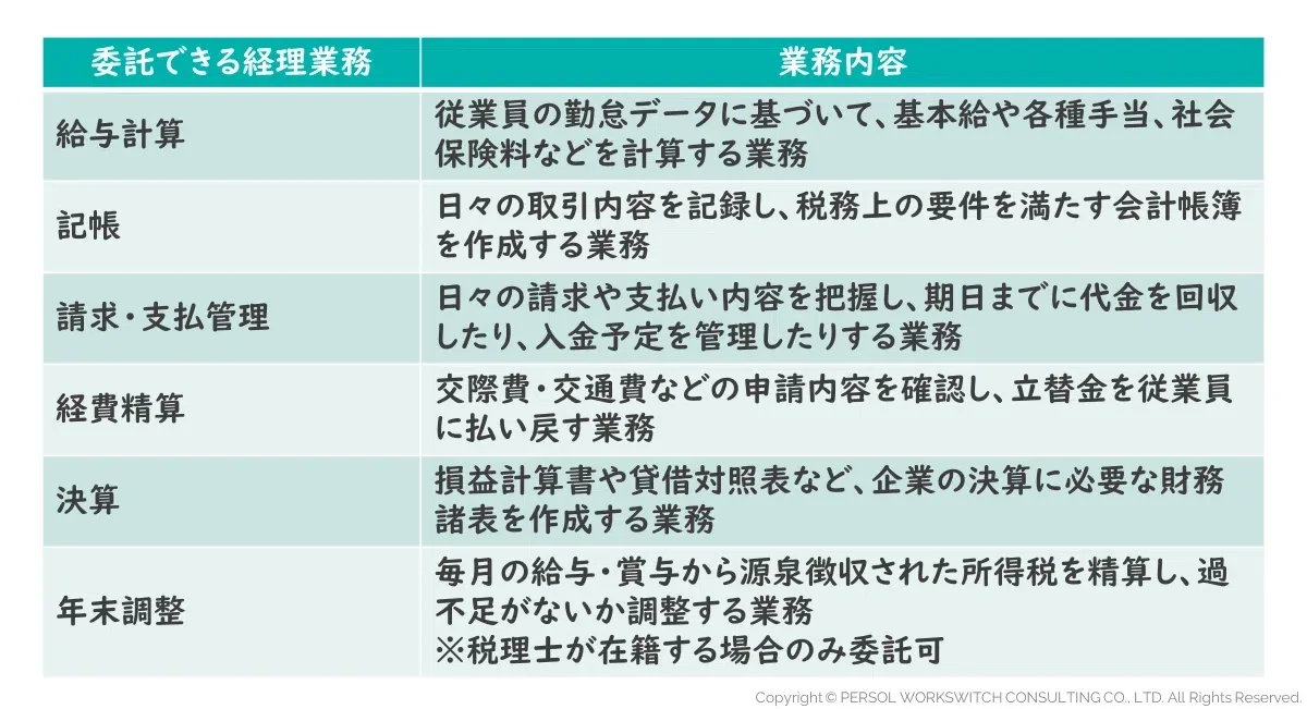 また、委託先によっては、必要なときだけスポットでアウトソーシングを依頼することも可能です。決算や年末調整などの繁忙期や、人員が足りない時期のみアウトソーシングするといった使い方もできます。
