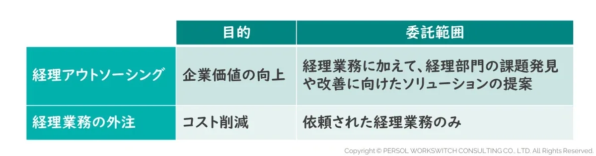 経理アウトソーシングと外注との違いは、以下の表の通りです。
