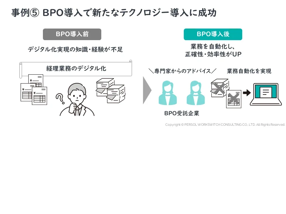 しかし、従来の経理部門ではデジタル化や自動化に関する知識や経験が限られているため、BPO企業と提携することを決めました。