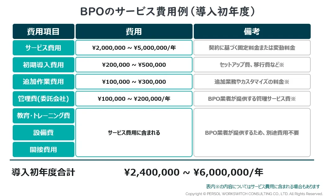 上記と同等の勤務時間数でアウトソーシングを依頼する場合、BPOのランニング費用は、年間でおよそ¥2,400,000 ~ ¥6,000,000※となり、一般的に雇用を実施するよりも費用面で抑えられるケースが多いです。正社員一人あたりの採用費も考慮した場合、その金額の差はさらに広がります。