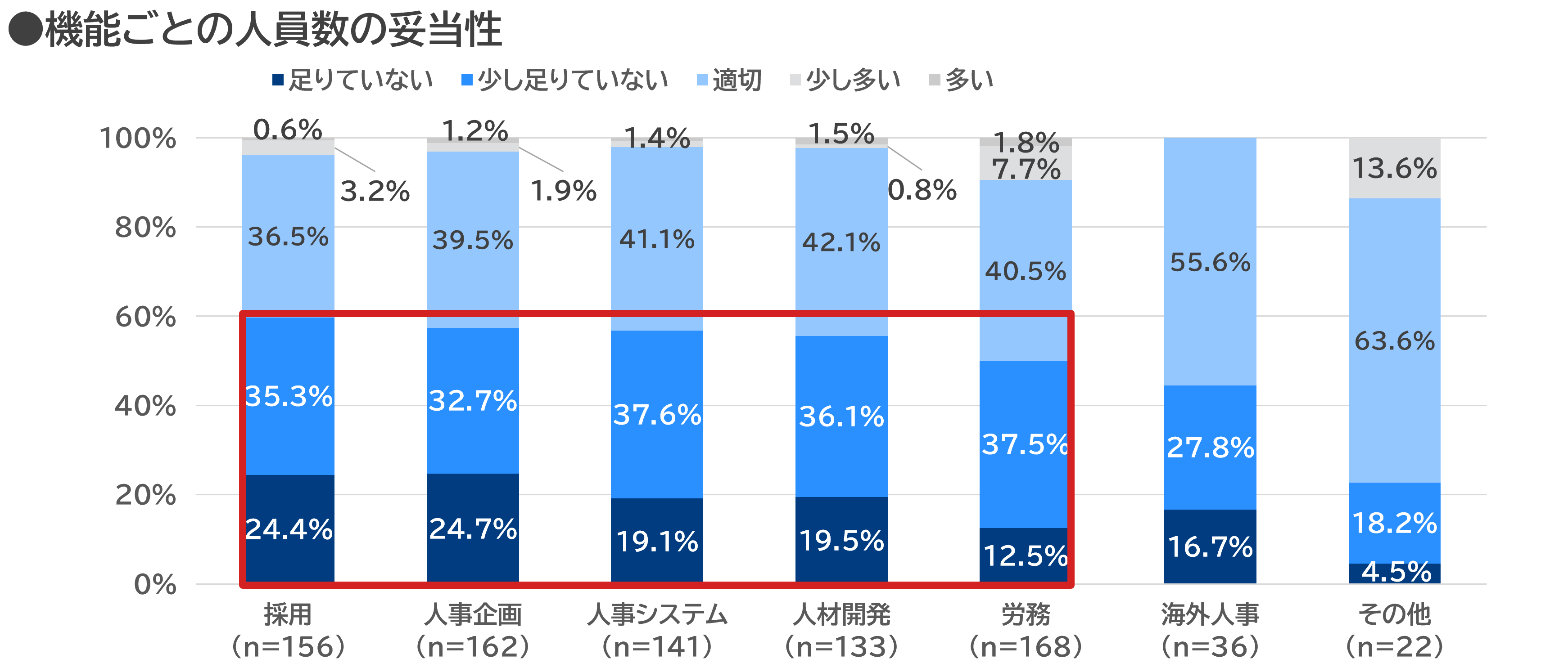 ・特に採用や人事企画では「足りていない」という回答が2割を超えており、他の項目と比べて不足を感じる割合が高い。