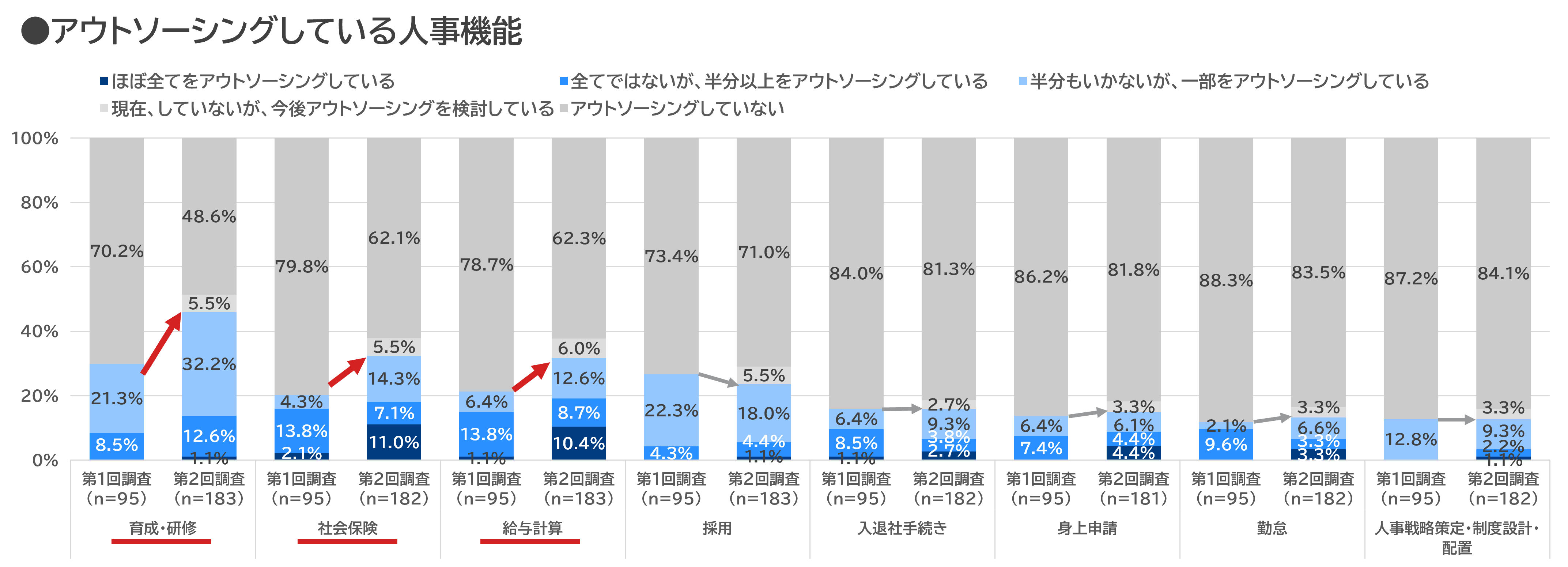 ▶ 人事業務をアウトソーシングする割合は全体的に増加傾向にあり、特に「育成・研修」のアウトソーシング実施率が上昇している。