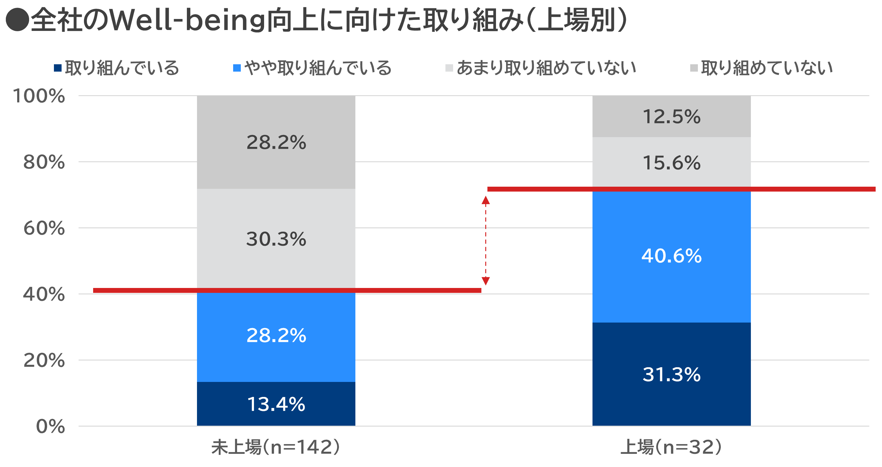 ・上場別でみると、上場企業は未上場企業よりもWell-being向上に向けた取り組みが約3割高い。