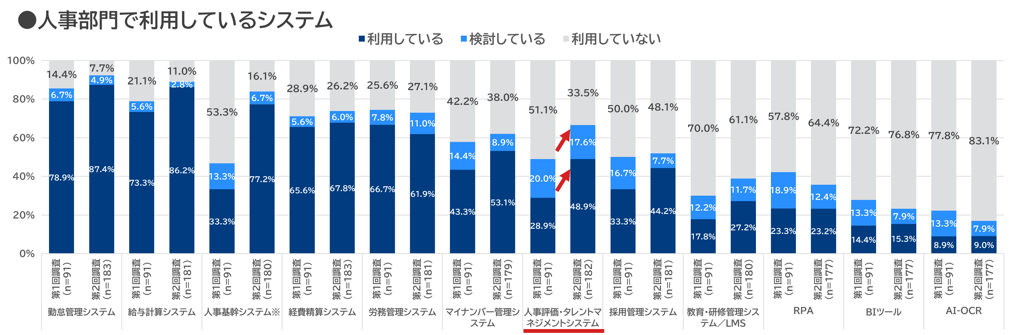 ・前回調査と比較すると、人事評価・タレントマネジメントシステムの利用率は 約2割高く、導入率が上がっている傾向にある。