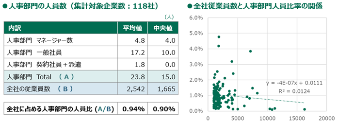 ・平均的な企業では人事部門の人員数を、全社従業員数の0.9%~0.94%程度としている。