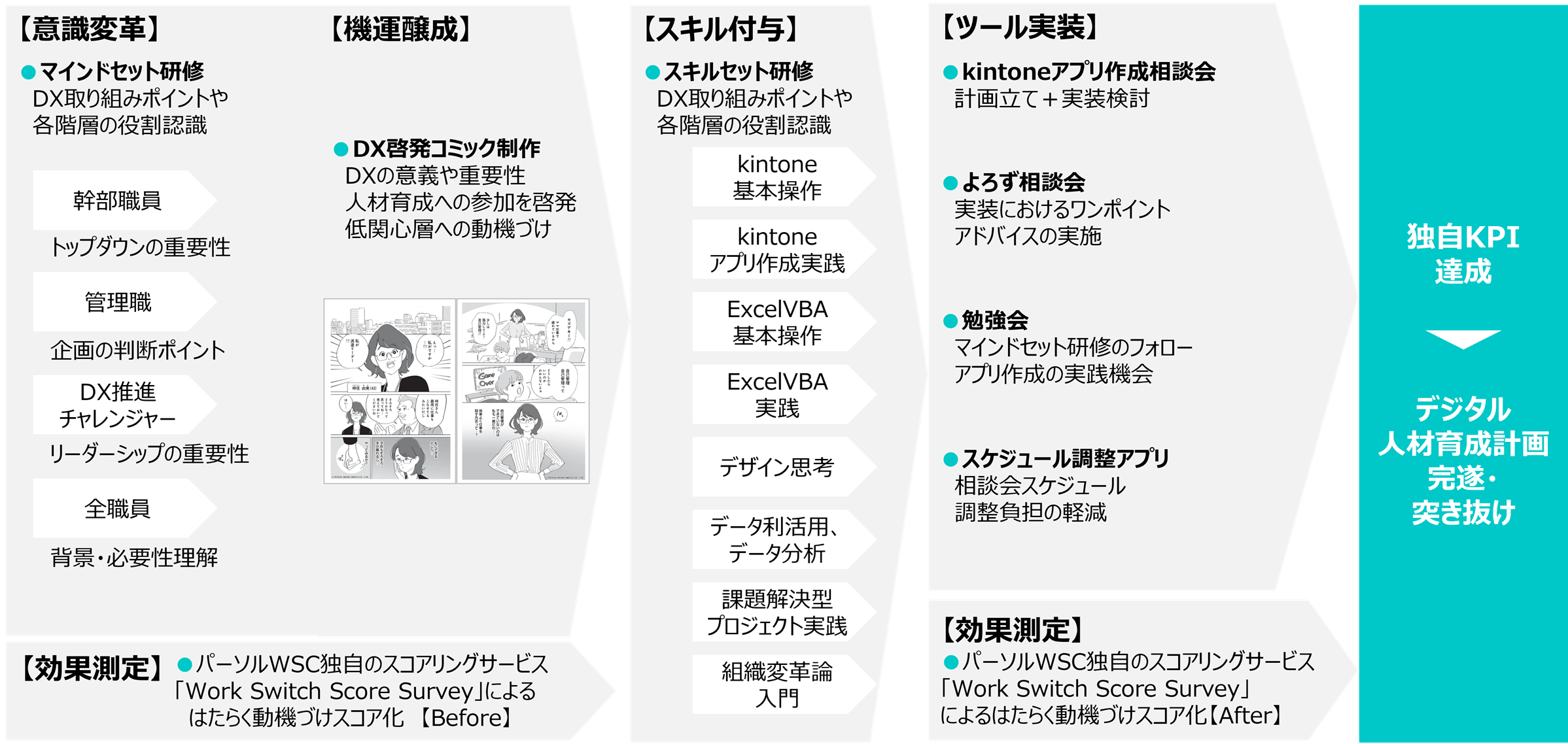 令和5年度に引き続き、「研修の実施(マインドセット研修、スキルセット研修)」や「相談業務支援(よろず相談会、kintoneアプリ作成相談会)」に加えて、DXの機運醸成に向けた「DX啓発コミック制作」や、当社独自のスコアリングサービス「Work Switch Score Survey」などによる効果測定で支援実施前後における“はたらく動機づけのスコア化”などを実施します。