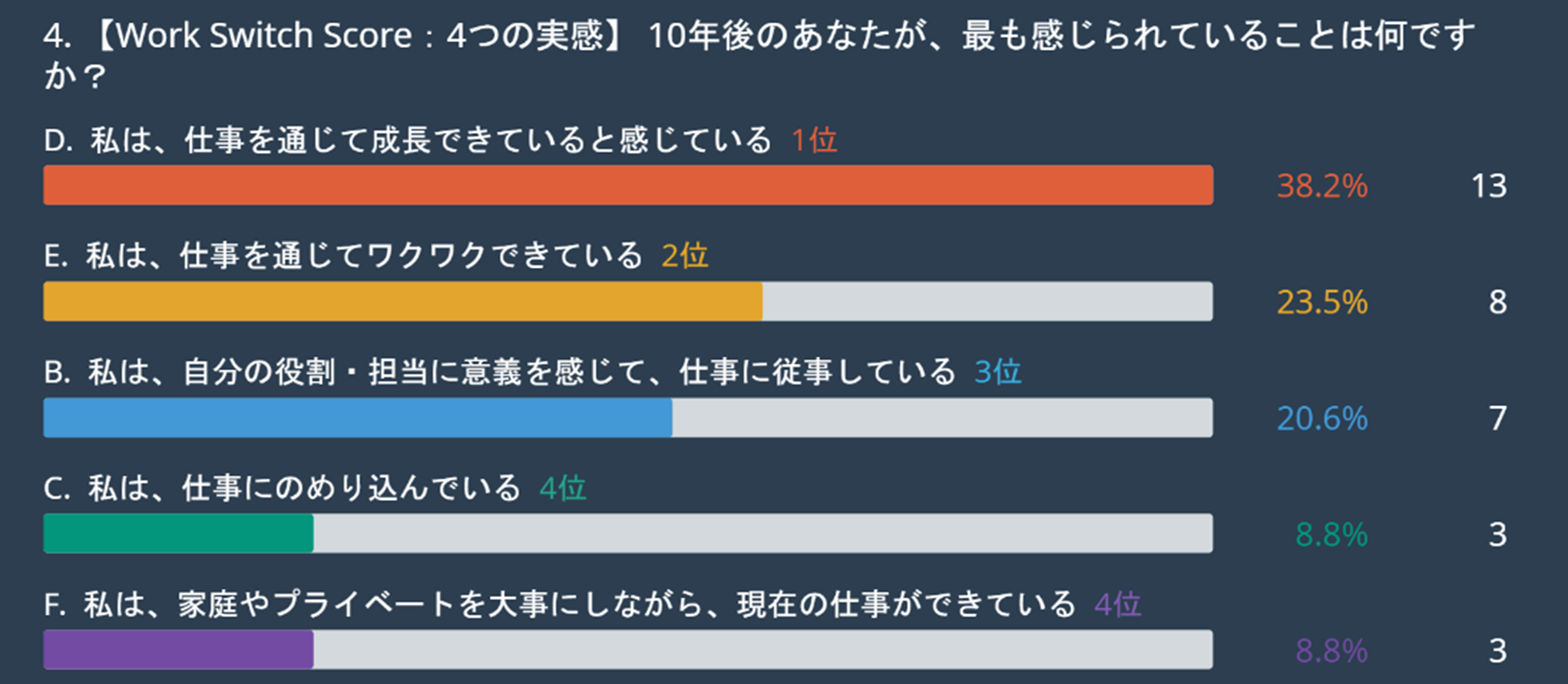 今回のワークショップでは、生徒の皆さん向けに簡易版「ワークスイッチスコア」を提供し、10年後の自分を想像しながら回答していただきました。上記の社会人が回答した結果では、「仕事観」、「成長」、「ワクワク」、「ワークライフバランス」の4つの実感値であまり差が見られなかったことに対して、生徒の皆さんが回答してくださった簡易版では、参加者の約4割が「私は、仕事を通じて成長できていると感じている(成長)」を選択し、最も高い結果となりました。続いて、「ワクワク」「仕事観」が続きましたが、「ワークライフバランス」を選択した生徒の数は最も少なく、社会人よりも生徒の方が「ワークライフバランス」以上に、“はたらく”ことに対して「成長」や「ワクワク」の実感を高く求めているという、生徒の“はたらく”に対する前向きな期待やモチベーションなどが見受けられる比較結果を確認することできました。