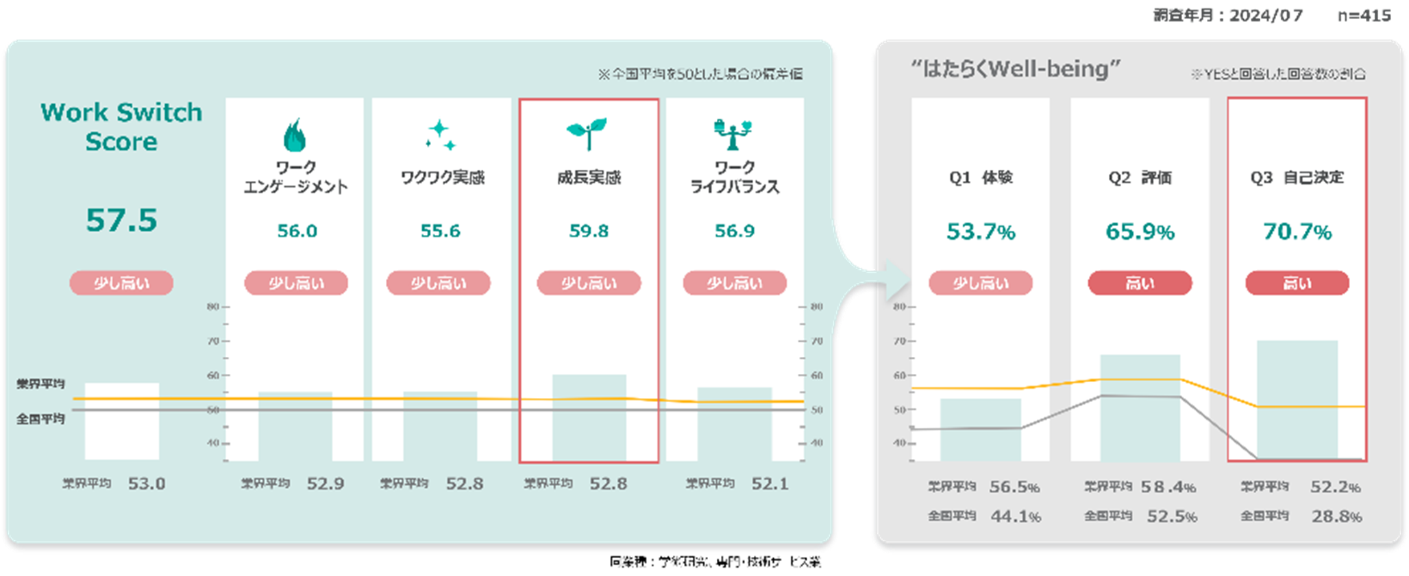 社会人向けに提供している「ワークスイッチスコア」は、個々人の「仕事観」、「成長」、「ワクワク」、「ワークライフバランス」などの実感値を可視化することを目的としています。実際に社会人(パーソルWSC社員)が回答した「ワークスイッチスコア」の4つの実感値は、他企業の全国平均・同業界(コンサルティング業を含む「学術研究・専門サービス業」)平均と比較していずれも「高い」状態にあります。「“はたらくWell-being”指標」では、特に「自己決定」が全国平均および業界平均よりもかなり高い状態にあります。