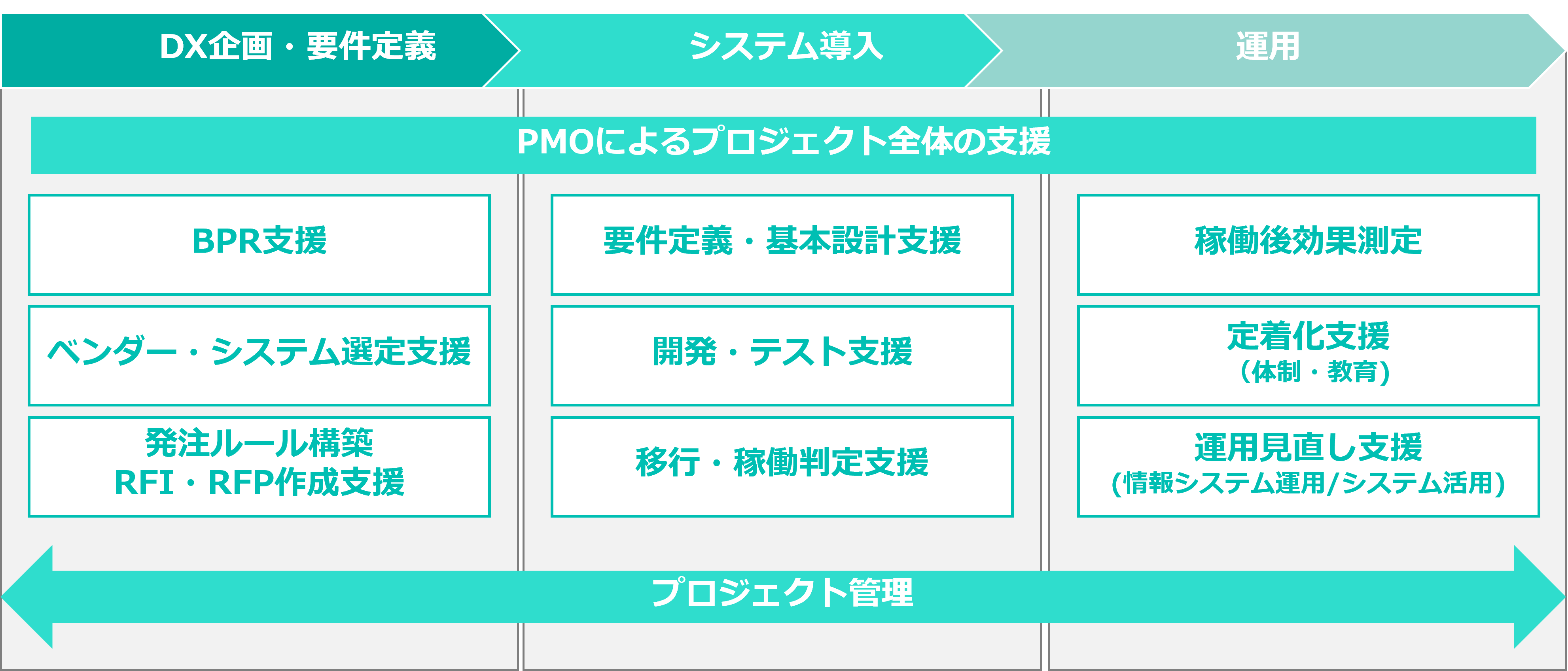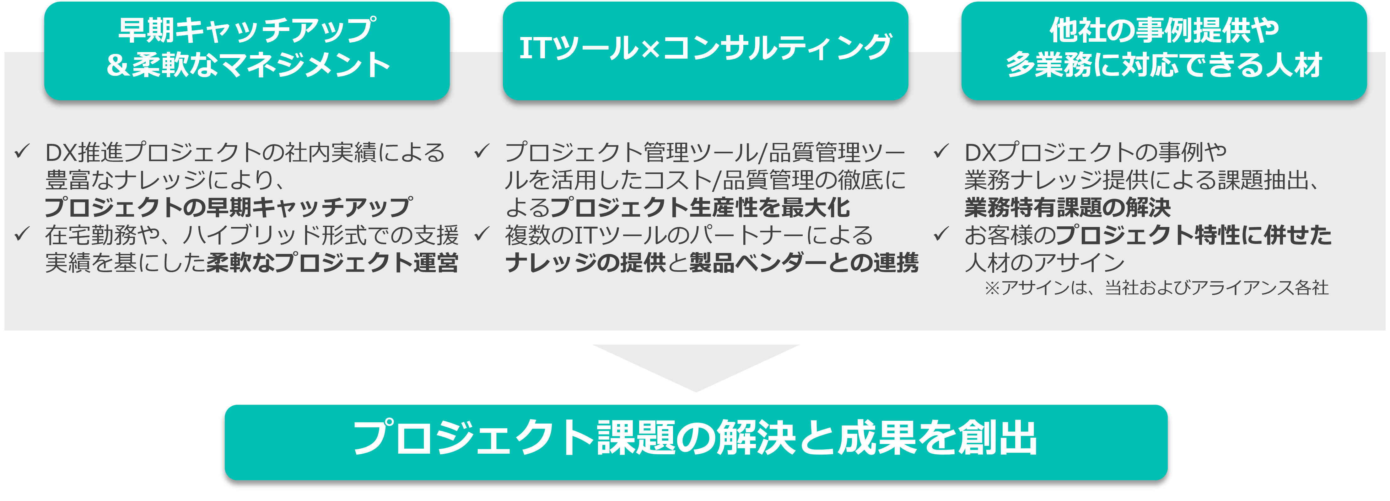 「DX-PMOサービス」は、プロジェクト課題の解決、成果創出を提供価値としています。