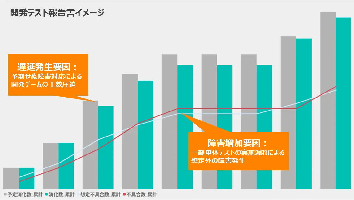 開発テスト実施時には、分析結果を可視化した上で報告します。
