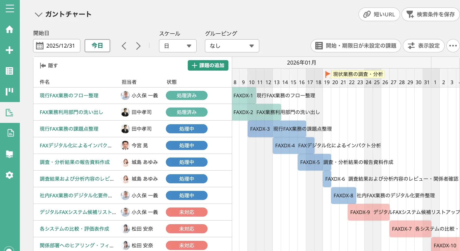各課題やタスクの開始時期・終了時期を可視化することが可能です。