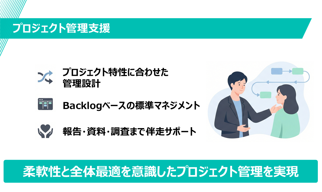プロジェクトの特性に応じて、管理手法の提案からプロジェクト推進までを支援します。進捗管理ツール「Backlog」を活用し、お客さまに最適な管理方法をご提供します。