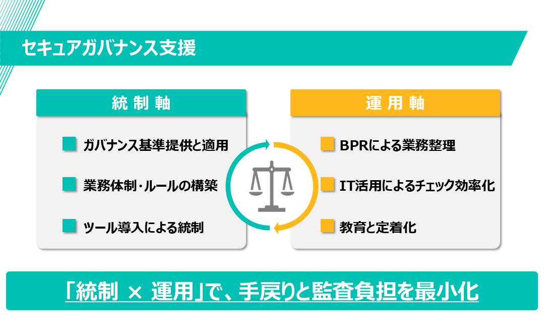 ガバナンス統制は “規制” ではなく “人を守る仕組み”です 。ツール活用とBPRで現場の工数・心理的負担を減らし、安全と効率を両立します。