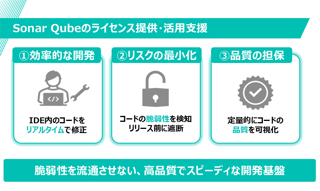 生成AIによる静的ソースコード解析ツール「SonarQube」のライセンス提供や活用の支援を通じて、開発者の生産性向上とセキュリティリスクの低減を実現します。